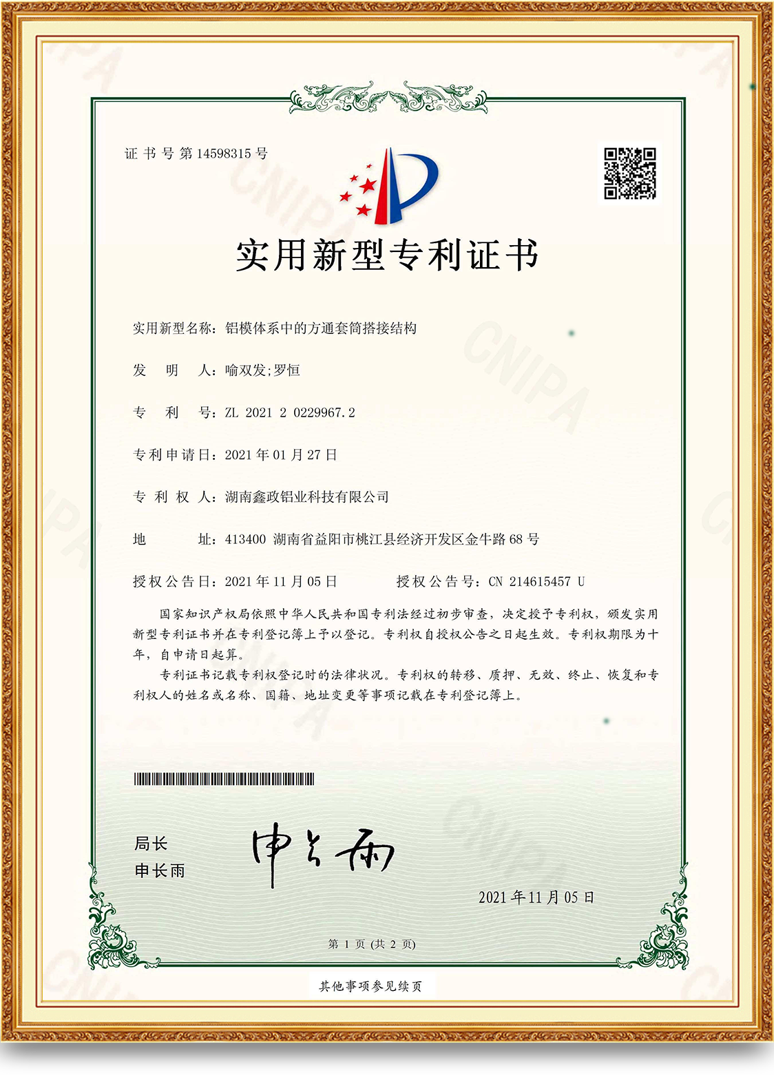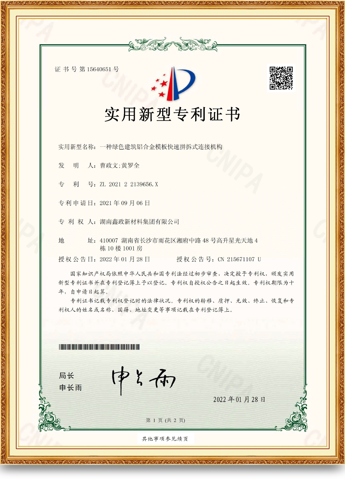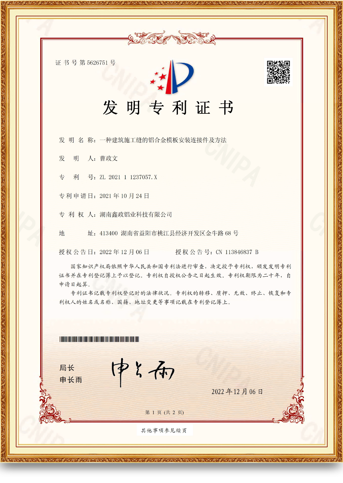 一種建筑施工縫的鋁合金模板安裝連接件及方法專利證書