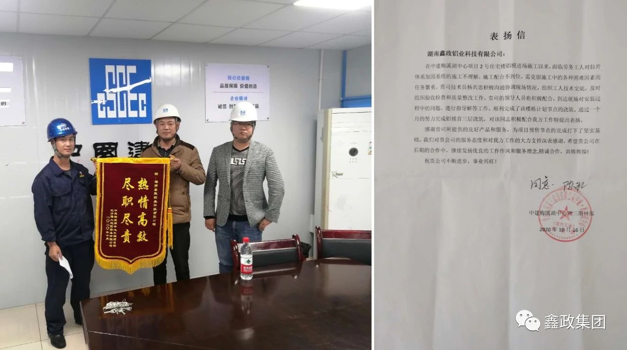 瀏覽次數:1845近日,中建五局第三建設有限公司中建梅溪湖中心項目部和現場勞務公司長沙博大建筑勞務有限公司送來錦旗和表揚信,對鑫政鋁業技術服務科楊共忠在項目上的出色表現給予了充分肯定和高度評價。_20250530091630A310.jpg)