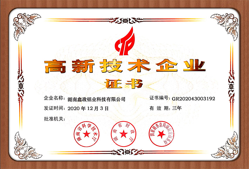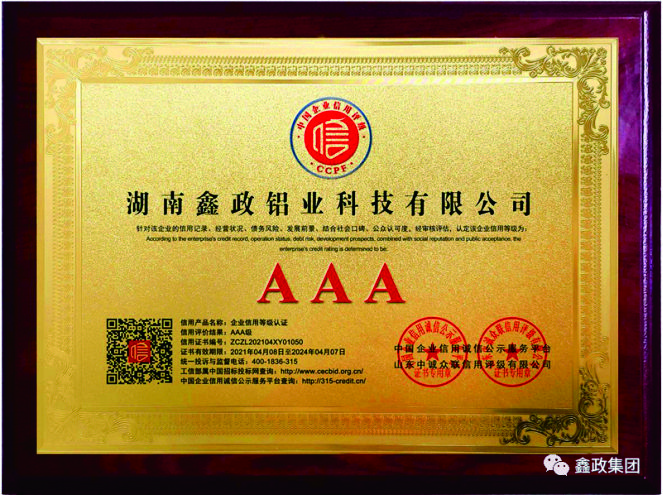 瀏覽次數(shù):1802近日,鑫政集團子公司鑫政鋁業(yè)喜報頻傳,再獲殊榮。根據(jù)湖南省2020年高新技術(shù)企業(yè)認定規(guī)定,經(jīng)專家評審、權(quán)威公示等程序,鑫政鋁業(yè)憑借產(chǎn)品研發(fā)、科研人才培養(yǎng)、質(zhì)量把控等方面的出色表現(xiàn),榮獲“高新技術(shù)企業(yè)”榮譽稱號。同時,經(jīng)過中國企業(yè)信用誠信公示服務(wù)平臺的嚴格審核,該公司榮獲“AAA級企業(yè)信用等級”證書。