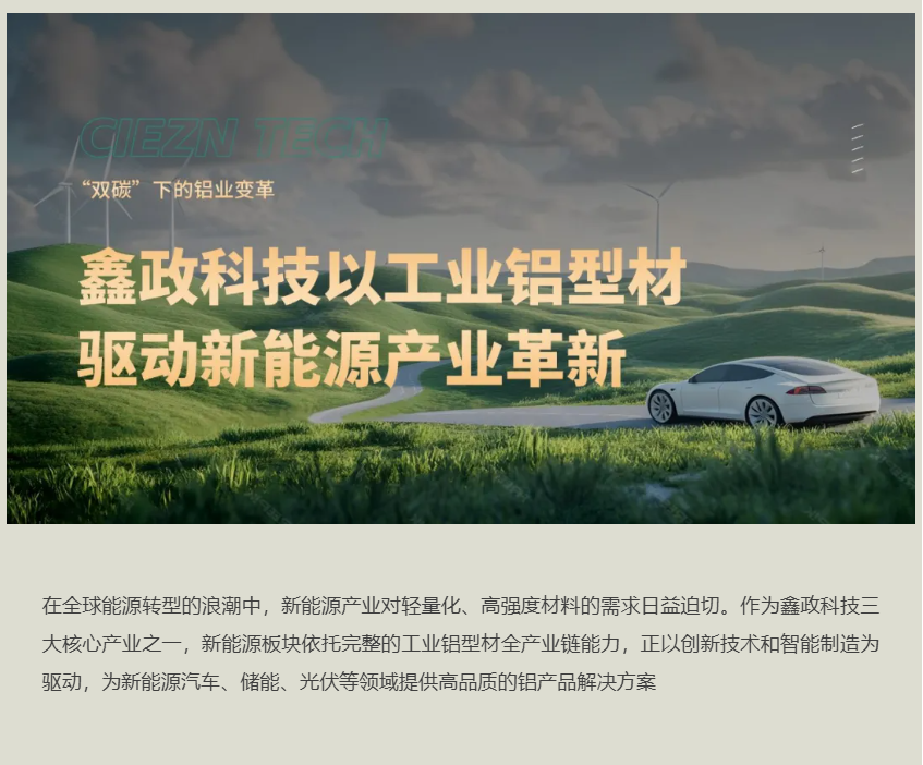 鑫政深耕工業(yè)鋁型材領(lǐng)域,全面布局新能源產(chǎn)業(yè),持續(xù)拓展產(chǎn)品矩陣。在汽車輕量化領(lǐng)域,創(chuàng)新研發(fā)電池托盤、端板、防撞梁、門檻梁等核心部件;在清潔能源領(lǐng)域,積極拓展儲(chǔ)能系統(tǒng)支架與光伏型材。通過(guò)特種合金黃金比例配方與精密壓延工藝的深度融合,鑫政正以材料創(chuàng)新和技術(shù)創(chuàng)新助力全球綠色產(chǎn)業(yè)升級(jí)。